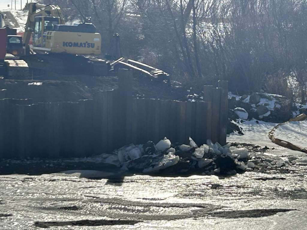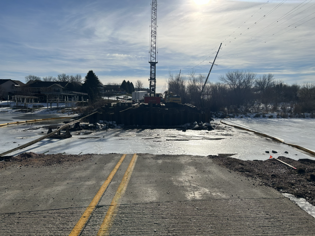 With utility conflicts resolved, construction moved forward and the existing culverts were removed. A coffer dam constructed from vertical steel sheets with interlocking tongue‑and‑groove connections was installed. These structures typically range from 40 to 60 feet in height and allow water to be pumped out so bridge piers and abutments can be installed.
