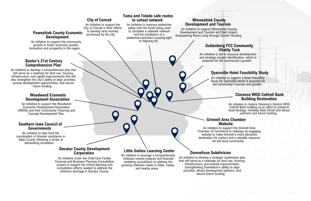 In 2025, a record number of Power of Connection grants were awarded to 14 communities across the state of Iowa. More than $58,000 was dispersed to stimulate economic growth in rural areas. The map below shows the receiving communities and initiatives these grants helped to support.
