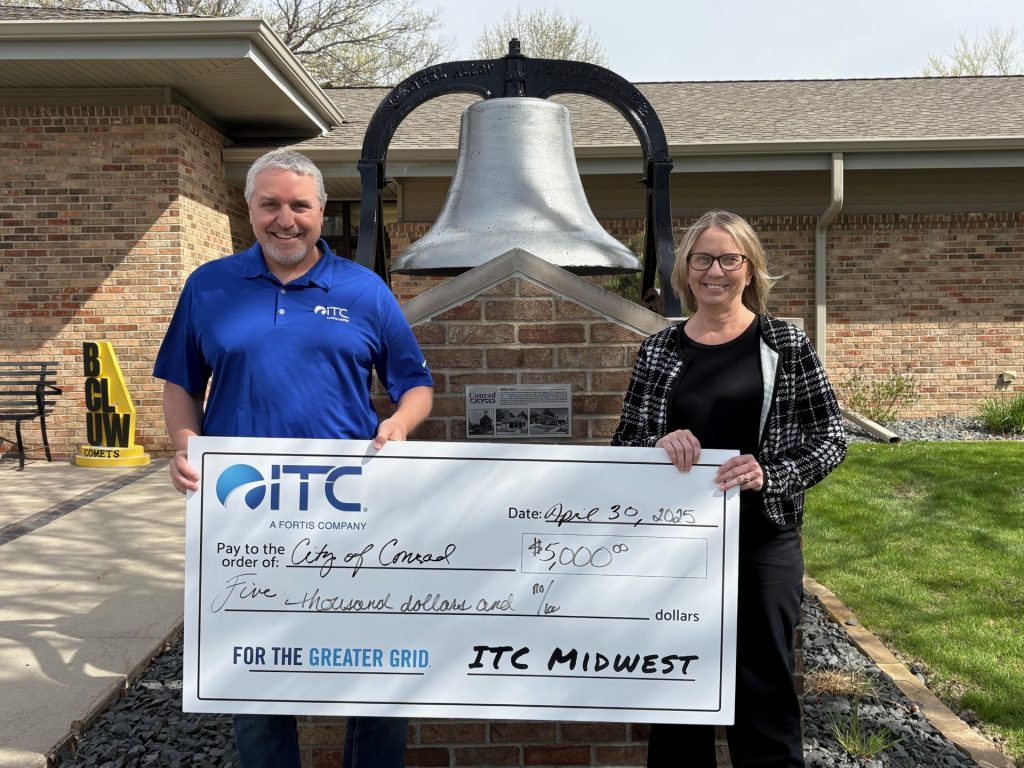 CONRAD, Iowa (May 19, 2025) — ITC Midwest has awarded a $5,000 Power of Connection grant to support the City of Conrad in their efforts to develop land recently purchased by the city. These funds will be used to cover a portion of the engineering fees associated with the project, which aims to enhance the community’s infrastructure and prepare for future commercial development.